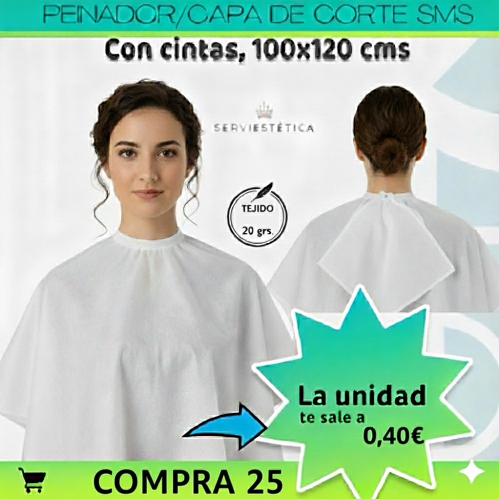 El peinador capa de corte desechable 20 grs, presentado en un paquete de 25 unidades, está confeccionado en tejido SMS (Spunbond‑Meltblown‑Spunbond) con una densidad de 20 g/m², ofreciendo un equilibrio ideal entre ligereza, confort y protección durante el corte de cabello en entornos profesionales.